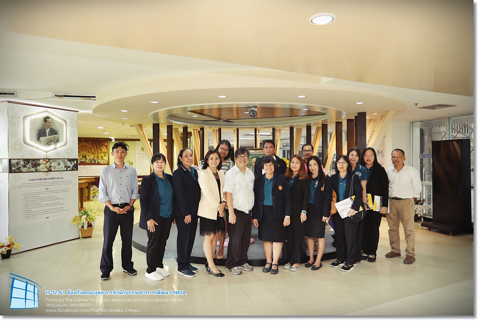 ผู้ช่วยศาสตราจารย์ ดร.ศิวนาถ นันทพิชัย ผู้อำนวยการศูนย์บรรณสารและสื่อการศึกษา มหาวิทยาลัยวลัยลักษณ์ พร้อมด้วยหัวหน้าฝ่ายต่างๆ ร่วมกับคุณสุภาณี เพชรานันท์ ส่วนสื่อสารองค์กร ให้การต้อนรับ บรรยายสรุป แก่บุคลากรสำนักบรรณสารการพัฒนา สถาบันบัณฑิตพัฒนบริหารศาสตร์ ในโอกาสศึกษาเรียนรู้งานศูนย์บรรณสารและสื่อการศึกษา เมื่อวันจันทร์ ที่ 17 ธันวาคม 2561 ที่ผ่านมา โดยจัดการต้อนรับและบรรยายสรุป ณ ห้องระเบียงบรรณ 1 อาคารบรรณสารและสื่อการศึกษา