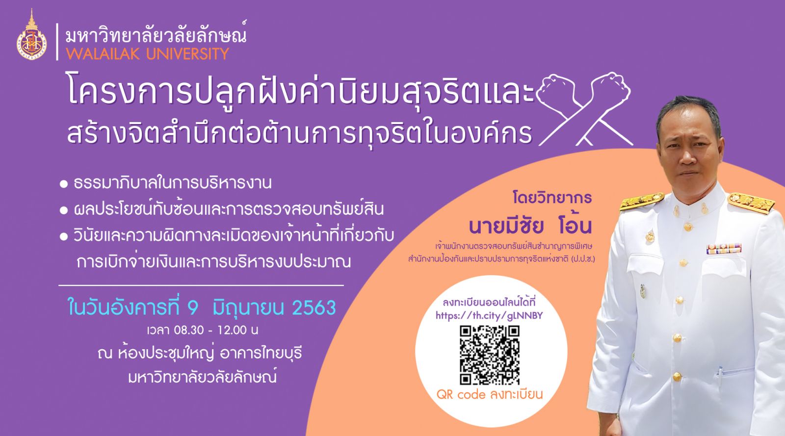 ทั้งนี้ เพื่อให้การดำเนินงานของมหาวิทยาลัยตอบสนองเกณฑ์การประเมินคุณธรรมและความโปร่งใสการดำเนินงานของหน่วยงานภาครัฐ  และเพื่อให้ความรู้ ความเข้าใจเรื่องผลประโยชน์ทับซ้อน และการเสริมสร้างวัฒนธรรมและปลูกฝังค่านิยมสุจริตให้กับผู้บริหารและบุคลากรของมหาวิทยาลัย หน่วยตรวจสอบภายในจึงจัด “โครงการปลูกฝังค่านิยมสุจริตและสร้างจิตสำนึกต่อต้านการทุจริตในองค์กร” ในวันอังคารที่ 9  มิถุนายน 2563 เวลา 08.30 – 12.00 น  ณ หอประชุมใหญ่ อาคารไทยบุรี โดยมี  นายมีชัย  โอ้น  เจ้าพนักงานตรวจสอบทรัพย์สินชำนาญการพิเศษ สำนักงานป้องกันและปราบปรามการทุจริตแห่งชาติ (ป.ป.ช.)  เป็นวิทยากรบรรยายในหัวข้อ (1) ธรรมาภิบาลในการบริหารงาน  (2) ผลประโยชน์ทับซ้อนและการตรวจสอบทรัพย์สิน  และ (3) วินัยและความผิดทางละเมิดของเจ้าหน้าที่เกี่ยวกับการเบิกจ่ายเงินและการบริหารงบประมาณ