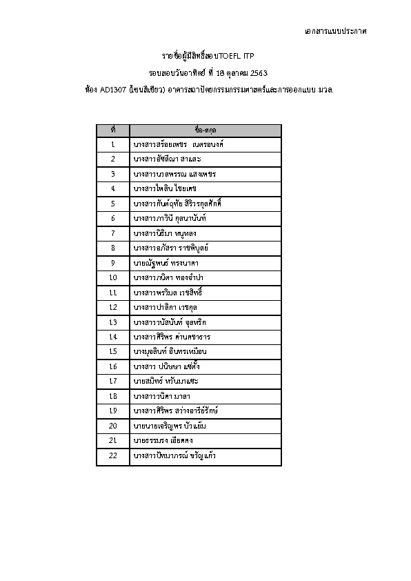 สำนักวิชาศิลปศาสตร์ บริการสอบTOEFL ITP สำหรับนักศึกษา บุคลากร และบุคคลทั่วไป ประจำภาคการศึกษาที่ 1/2563 ในวันอาทิตย์ที่ 18 ตุลาคม 2563 จึงขอแจ้งรายละเอียด คู่มือ กำหนดการ และรายชื่อผู้มีสิทธิ์สอบมาเพื่อทราบ ตามเอกสารแนบ