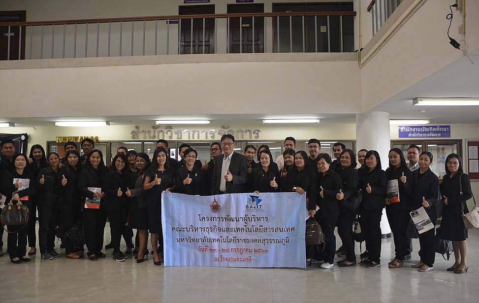 ผู้บริหารคณะบริหารธุรกิจและเทคโนโลยีสารสนเทศ มหาวิทยาลัยเทคโนโลยีราชมงคลสุวรรณภูมิ จำนวน 30 คน นำโดย ผศ.ดร.สาลินันท์ บุญมี คณบดี ศึกษาดูงาน "ระบบการจัดการเรียนการสอนสำนักวิชาการจัดการ มหาวิทยาลัยวลัยลักษณ์" โดยมี รศ.ดร.สมนึก เอื้อจิระพงษ์พันธ์ คณบดี และคณาจารย์ร่วมให้การต้อนรับและบรรยายสรุป เมื่อวันที่ 25 กรกฎาคม 2560 เวลา 09.00-12.00 น. ณ ห้องประชุม 101 อาคารวิชาการ 3