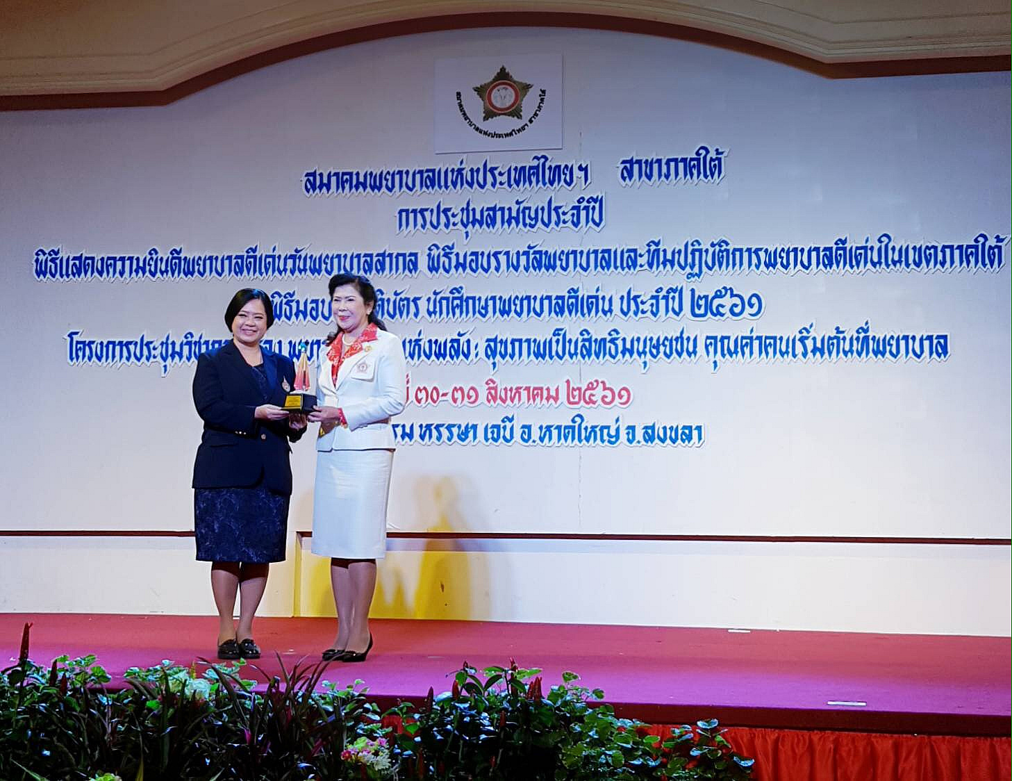 รองศาสตราจารย์ ดร.วิภาวรรณ ชะอุ่ม เพ็ญสุขสันต์ คณบดีสำนักวิชาพยาบาลศาสตร์ มหาวิทยาลัยวลัยลักษณ์ เข้ารับรางวัลพยาบาลดีเด่น ประจำปี 2561 สาขาการศึกษาพยาบาล ระดับผู้บริหารการศึกษาพยาบาล จาก ผู้ช่วยศาสตราจารย์ ดร.จิรพรรณ พีระวุฒิ นายกสมาคมพยาบาลแห่งประเทศไทยฯสาขาภาคใต้ ในงานการประชุมสามัญประจำปี พิธีแสดงความยินดีพยาบาลดีเด่นวันพยาบาลฯ ซึ่งสมาคมพยาบาลแห่งประเทศไทยฯ สาขาภาคใต้จัดขึ้น เมื่อวันที่ 30 สิงหาคม 2561 ณ โรงแรมหรรษา เจปี หาดใหญ่ จ.สงขลา