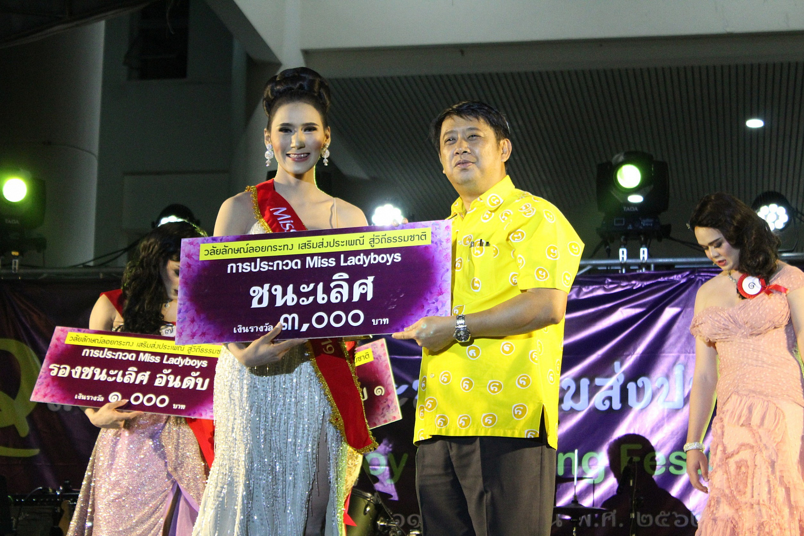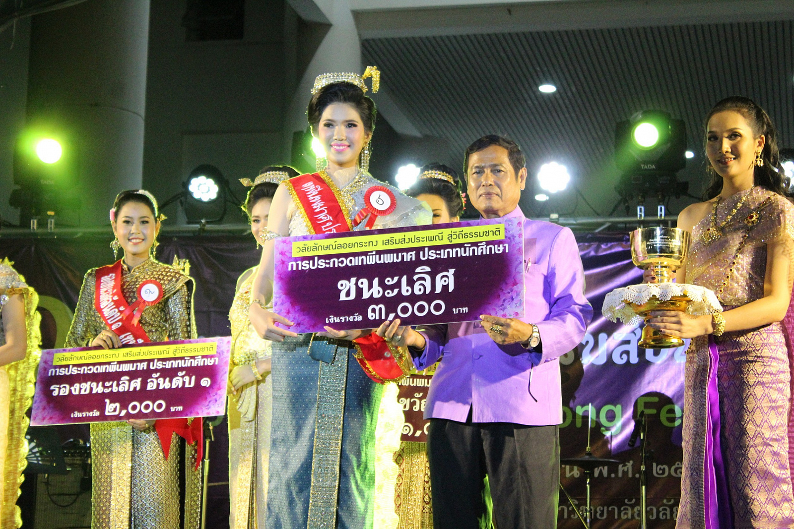 ทั้งนี้ผู้ที่ได้รับรางวัลชนะเลิศ ในแต่ละประเภทได้รับเงินรางวัลจำนวน 3,000 บาท พร้อมสายสะพาย ขันน้ำพานรองและเกียรติบัตร ส่วนรองชนะเลิศอันดับ 1 รองชนะเลิศอันดับ 2 และรางวัลขวัญใจมหาชน ได้รับเกียรติบัตรพร้อมเงินรางวัลจำนวน 2000, 1000 และ 1000 บาทตามลำดับ