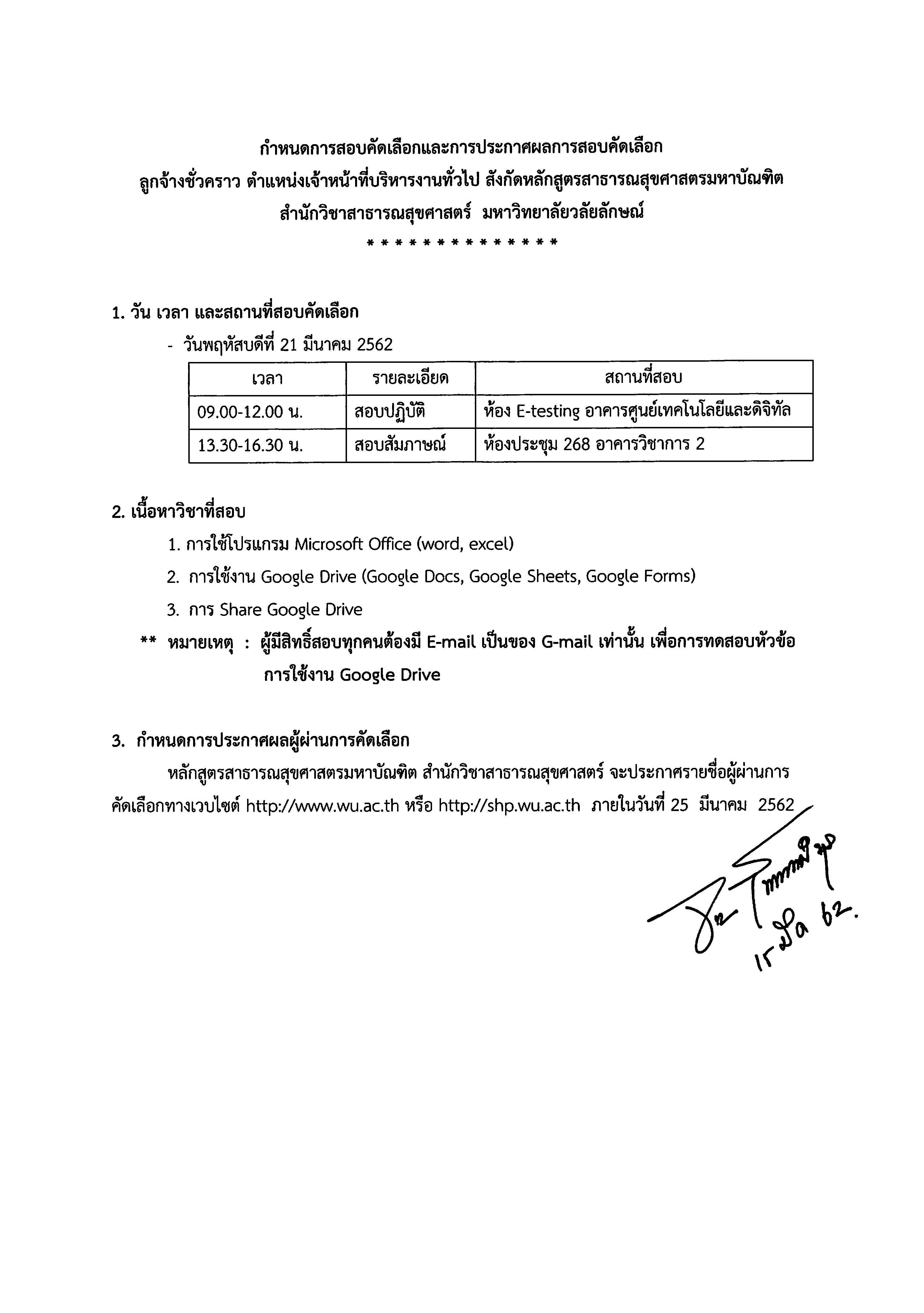 ตามที่หลักสูตรสาธารณสุขศาสตรมหาบัณฑิต สำนักวิชาสาธารณสุขศาสตร์ ได้ประกาศรับสมัครสอบคัดเลือกบุคคลทั่วไปเพื่อบรรจุเป็นลูกจ้างชั่วคราว ตำแหน่งเจ้าหน้าที่บริหารงานทั่วไป จำนวน 1 อัตรา รายละเอียดดังแจ้งแล้ว นั้น
