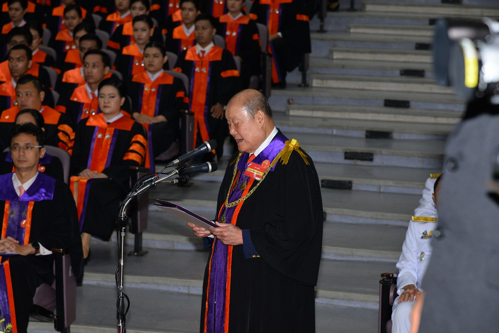 ในการนี้ พระราชทานพระโอวาทแก่ผู้สำเร็จการศึกษา ความว่า “ความรู้ในหลักวิชาที่บัณฑิตได้ศึกษาจากมหาวิทยาลัย จนสำเร็จการศึกษาโดยทั่วกันแล้วนี้ จัดว่าเป็นความรู้เฉพาะด้านเฉพาะสาขา ตามหลักสูตรที่แต่ละคนได้เล่าเรียนมา แต่ในการทำงานนั้น นอกจากจะต้องใช้ความรู้ในสาขาวิชาที่เฉพาะเจาะจงลงไปแล้ว ยังต้องอาศัยความรู้อื่นๆ ด้วย ไม่ว่าจะเป็นความรู้ในสาขาวิชาอื่นที่เกี่ยวข้อง หรือความรู้รอบตัว ตลอดจน ความก้าวหน้าทางวิชาการและข่าวสารข้อมูลต่างๆ บัณฑิตทุกคนเมื่อออกไปทำงาน จึงต้องมีความมุ่งมั่นพากเพียร ที่จะศึกษาหาความรู้เพิ่มเติมโดยไม่หยุดยั้ง ให้มีความรู้ทั้งด้านลึกทั้งด้านกว้างและข้อมูลข่าวสารที่ทันการณ์ทันสมัย นอกจากนี้ ยังจำเป็นต้องฝึกฝนอบรมคุณธรรม ให้เจริญงอกงามขึ้นในตนด้วย เพราะคุณธรรมความสุจริตจะคอยกำกับประคับประคองบุคคล ให้นำความรู้ไปใช้แต่ในทางที่ดีที่ถูกต้อง เพื่อให้ บังเกิดผลที่ดีที่เป็นประโยชน์สร้างสรรค์ทั้งแก่ตนเองเเละส่วนรวม ถ้าทำได้ดังที่กล่าวมานี้ บัณฑิตก็จะมีความรู้เป็นเครื่องมืออันทรงประสิทธิภาพในการปฏิบัติงานให้สำเร็จผล และมีคุณธรรมเป็นเครื่องป้องกันตนให้ห่างพ้นจากความชั่วความเสื่อม แต่ละคนก็จะสามารถสร้างสรรค์ประโยชน์ คือความดีความเจริญที่แท้ ให้แก่ตนเอง แก่สังคม และแก่ประเทศชาติได้อย่างสมบูรณ์และยั่งยืน”