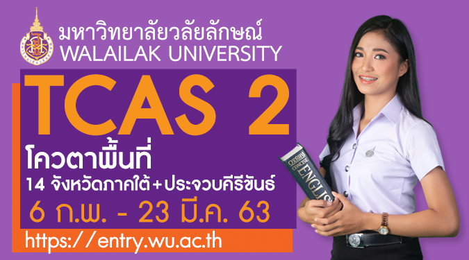 มหาวิทยาลัยวลัยลักษณ์ รับสมัครนักศึกษา TCAS รอบ 2 โควตาพื้นที่ 14 จังหวัดภาคใต้และจังหวัดประจวบคีรีขันธ์ ผ่านทางระบบอินเทอร์เน็ต http://entry.wu.ac.th จำนวน 2,251 คน ตั้งแต่บัดนี้ถึงวันที่ 23 มีนาคม 2563
