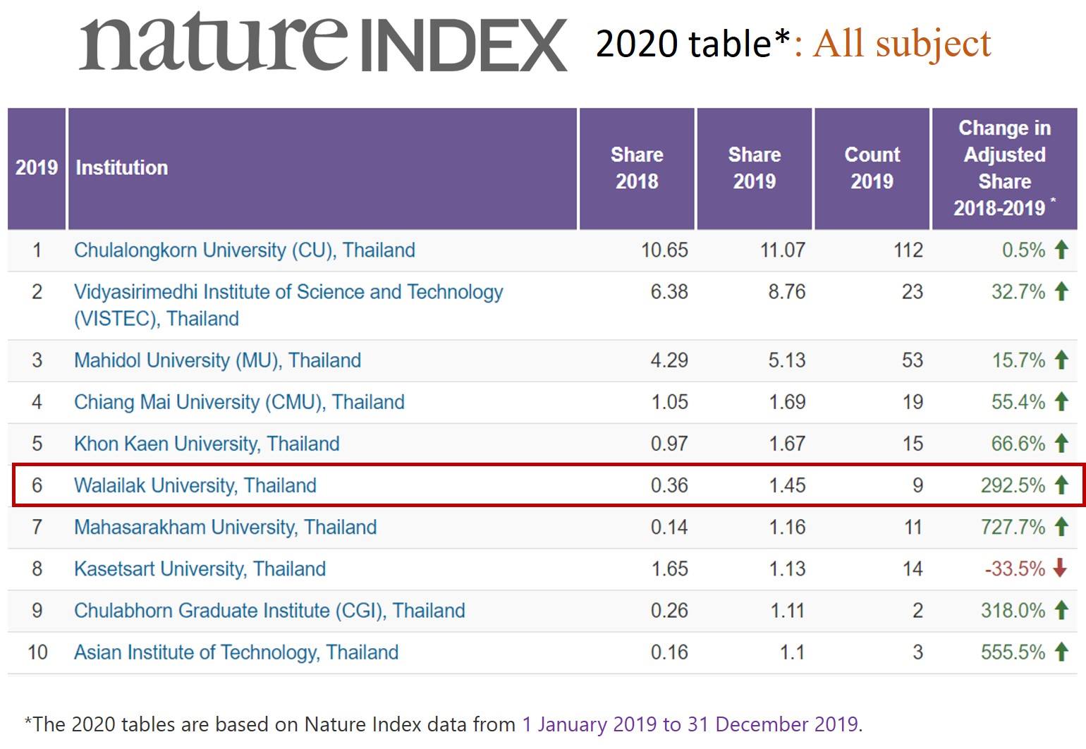 อย่างไรก็ตาม หากดูภาพรวมครอบคลุมทั้งในด้าน  Physical Sciences, Life Sciences, Chemistry และ Earth & Environmental Sciences  ผลปรากฎว่าในช่วงดังกล่าว มหาวิทยาลัยวลัยลักษณ์ได้รับการจัดอันดับจาก Nature Index Ranking ให้อยู่ในอันดับที่ 6 ของประเทศไทย  ซึ่งเป็นผลมาจากการเผยแพร่ 5 ผลงานวิจัยสำคัญ ดังนี้ 1) ผลงานวิจัยเกี่ยวกับ Deformed Starobinsky model in gravity’s rainbow เผยแพร่ในวารสาร European Physical Journal C โดยมี รองศาสตราจารย์ ดร. พงษ์พิชิต จันทร์นุ้ย เป็น First author