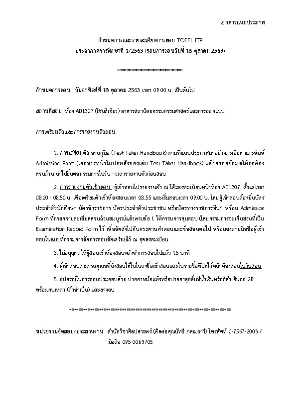 สำนักวิชาศิลปศาสตร์ บริการสอบTOEFL ITP สำหรับนักศึกษา บุคลากร และบุคคลทั่วไป ประจำภาคการศึกษาที่ 1/2563 ในวันอาทิตย์ที่ 18 ตุลาคม 2563 จึงขอแจ้งรายละเอียด คู่มือ กำหนดการ และรายชื่อผู้มีสิทธิ์สอบมาเพื่อทราบ ตามเอกสารแนบ