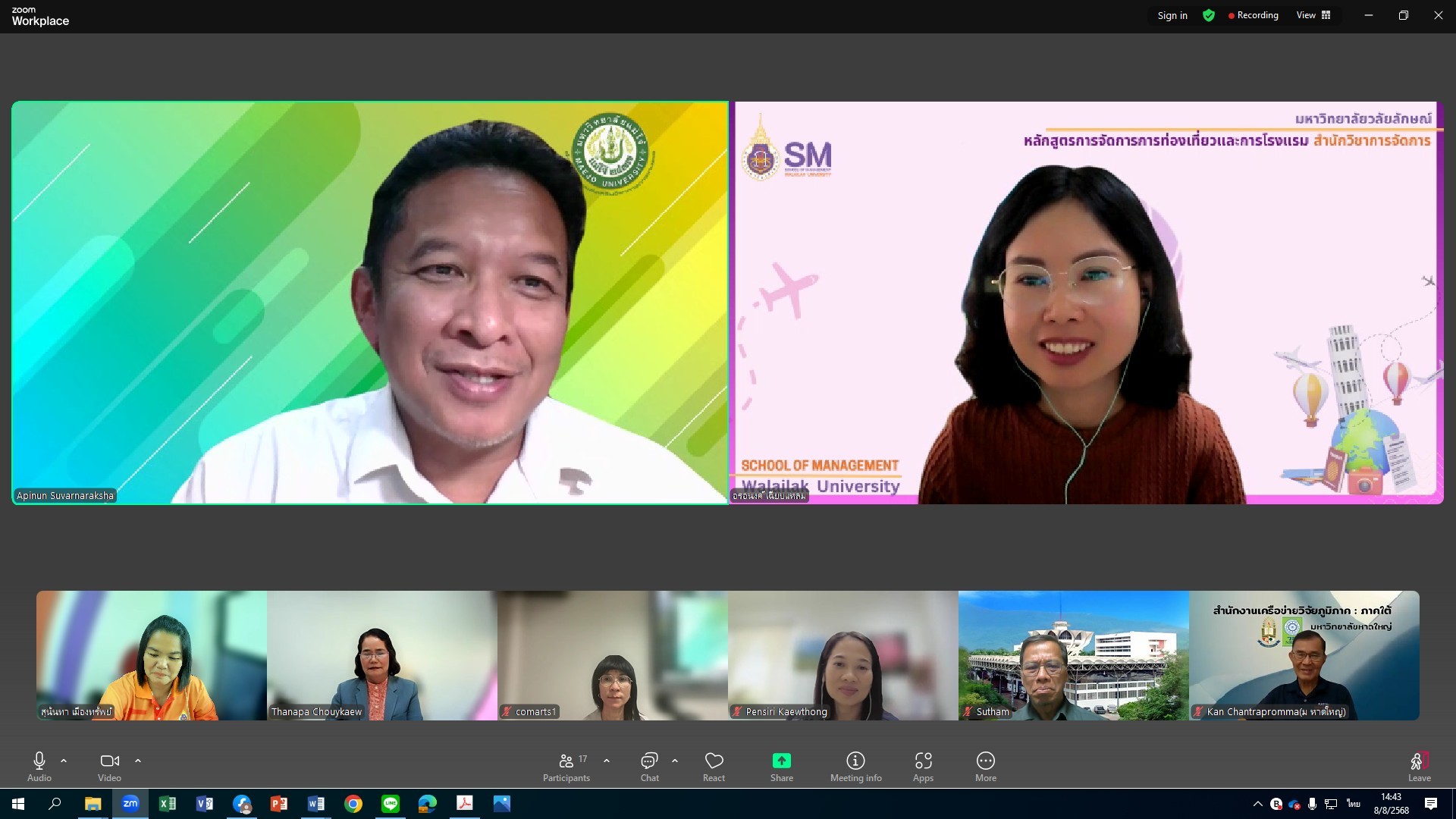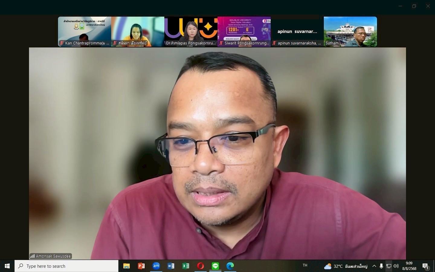 เมื่อวันที่ 8 สิงหาคม 2568 ผู้ช่วยศาสตราจารย์ ดร.อมรศักดิ์ สวัสดี ผู้อำนวยการศูนย์บริการวิชาการ มหาวิทยาลัยวลัยลักษณ์ ได้กล่าวเปิดกิจกรรมนำเสนอปิดโครงการการศึกษาศักยภาพเพื่อยกระดับการพัฒนาเชิงพื้นที่ของเครือข่าย และจัดทำข้อเสนอโครงการและแผนปฏิบัติงานวิจัย (Preliminary Research) ปีงบประมาณ พ.ศ. 2566 และ 2567 ภายใต้การดำเนินงานเครือข่ายบริหารการวิจัยภาคใต้ตอนบน ขึ้นในวันศุกร์ที่ 8 สิงหาคม 2567 ผ่านระบบ Zoom Meeting ในนามประธานเครือข่ายเครือข่ายบริหารการวิจัยภาคใต้ตอนบน ผู้รับผิดชอบงานโครงการเครือข่ายฯ ในปีงบประมาณ พ.ศ.2566 และ 2567 โดยมีสมาชิกสถาบันอุดมศึกษาภายในเครือข่ายภาคใต้ตอนบน จำนวน 12 สถาบัน ได้แก่ 1) มรภ.สุราษฎธานี 2) มรภ.นครศรีธรรมราช 3) มรภ.ภูเก็ต 4) ม.อ. วิทยาเขตสุราษฎร์ธานี 5) ม.วลัยลักษณ์ 6) ม.ตาปี 7) ม.แม่โจ้-ชุมพร 8) สจล. วิทยาเขตชุมพร 9) มทร.ศรีวิชัย วิทยาเขตนรคศรีธรรมราช 10) วิทยาลัยชุมชนพังงา 11) วิทยาเทคโนโลยีภาคใต้ 12) วิทยาลัยชุมชนระนอง ซึ่งดำเนินงานครอบคลุมพื้นที่ภาคใต้ตอนบน 7 จังหวัด (นครศรีธรรมราช, สุราษฎร์ธานี, ชุมพร, ระนอง, กระบี่, พังงา และภูเก็ต) ได้กำหนด